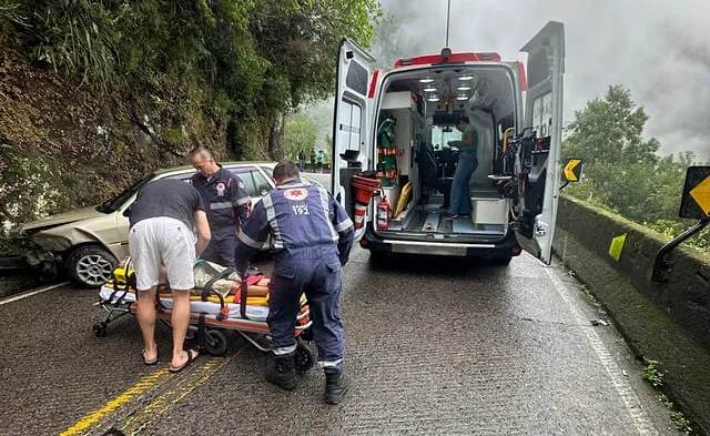 O condutor do VW/Gol alegou que perdeu o controle do veículo, devido à pista de concreto molhada pela chuva, e acabou colidindo frontalmente contra a encosta de pedras.